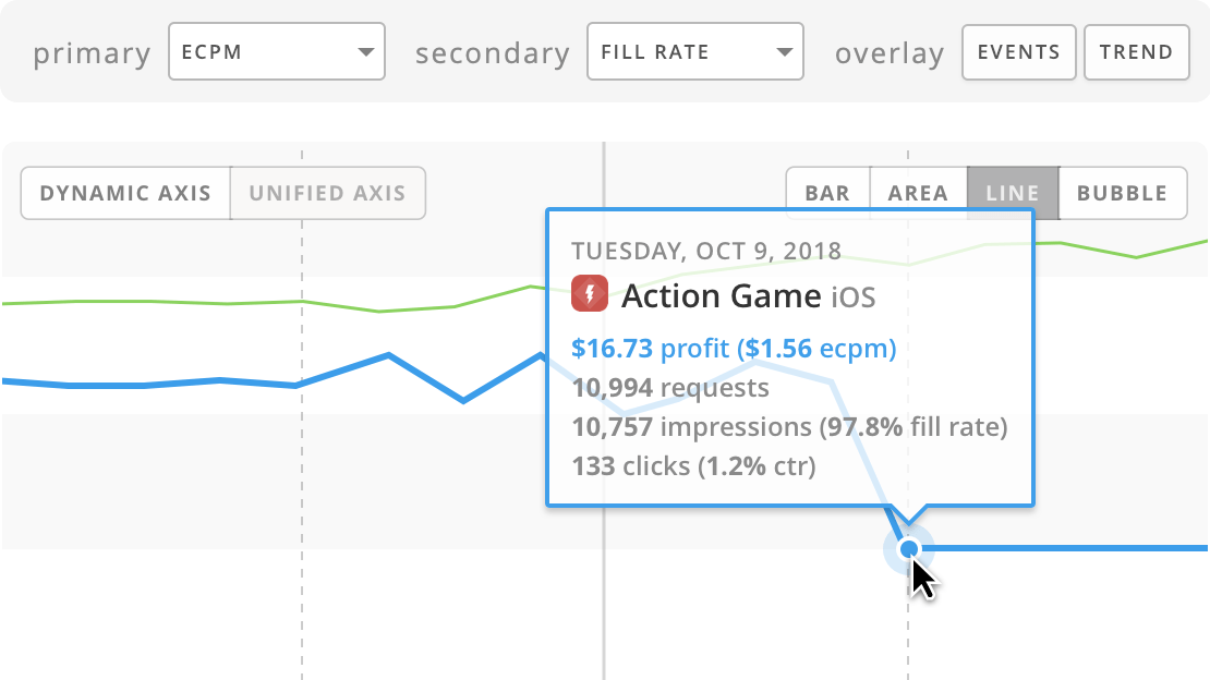 Things change often. Having all of your ad KPIs for all of the different (demand partners) you leverage in one place makes identifying anomalies such as a drop in ecpm or fill rate easy, so you can catch them before they turn into lost revenue.